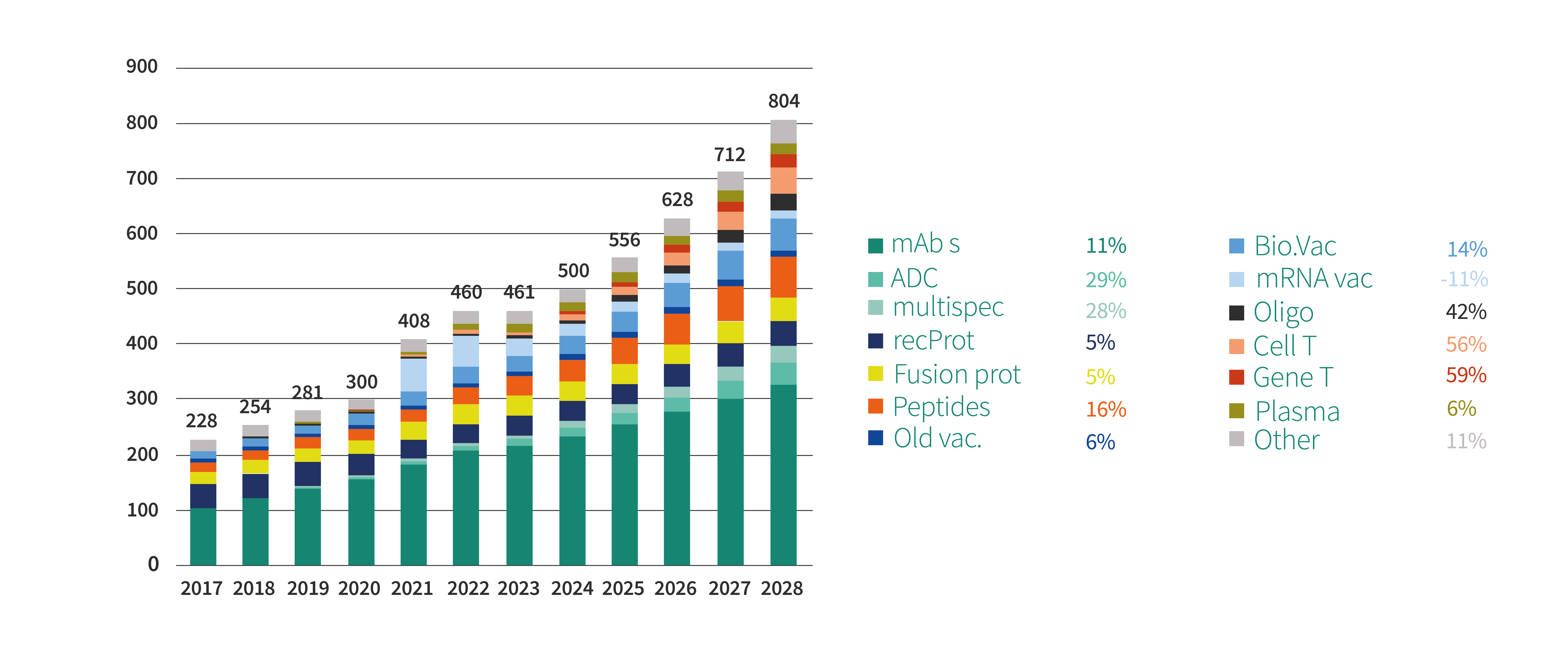 آنتیبادیهای مونوکلونال (mAbs) همچنان پیشتاز بازار هستند و تا سال 2028 نزدیک به نیمی از درآمد بیولوژیکها را به خود اختصاص خواهند داد.