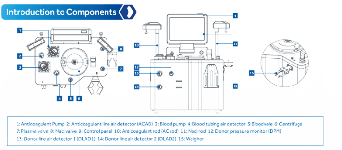 سیستم XJ-III شامل واحد اصلی (سانتریفیوژ، پمپ خون، پمپ ضدانعقاد، ترازوی پلاسما، صفحه نمایش، پنل کنترل، پایشگر فشار، آشکارساز هوا)، کاف فشاری و نرم افزار ثبت اطلاعات می باشد.